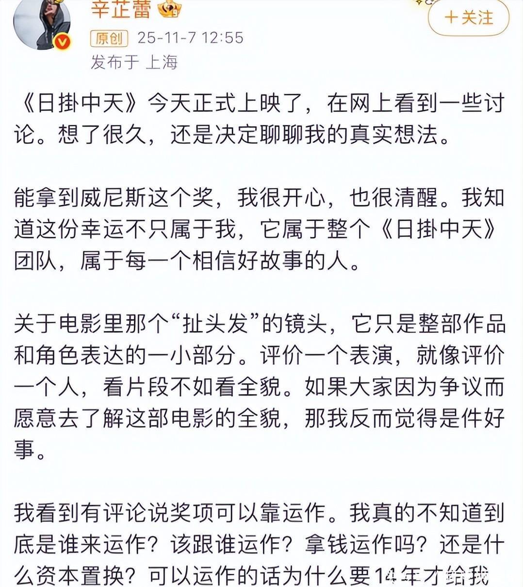 前段时间辛芷蕾拿下了影后头衔,然而就在这部电影上映的当天辛芷蕾发出了一篇小作文,